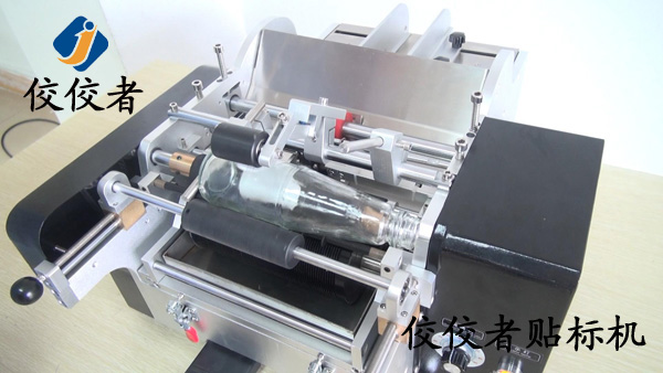 將玻璃瓶放到貼標(biāo)機(jī)上,隨著瓶子的轉(zhuǎn)動便被貼上了標(biāo)簽,如下圖: