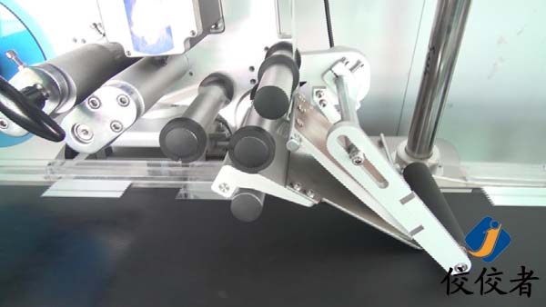 鏡片貼標機工作時要先把鏡片放到上圖機器的左側(cè),隨著傳送帶的轉(zhuǎn)動,鏡片們被送到下圖的這個小黑柱體下面,等鏡片完全經(jīng)過時便被貼上了標簽,如下圖: