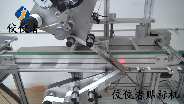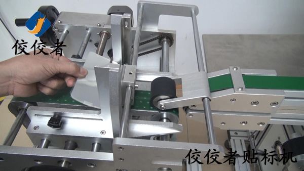 上圖展示的是工作人員將手機保護膜放在調(diào)整好寬窄的放料槽中,可一次放置多張,以不超過擋料板為限,此時有一個步驟在圖片中沒有展示出來,那就是接通電源之后工作人員要調(diào)整好貼標(biāo)頭的高低和前后位置,還有在人機界面上設(shè)定好相關(guān)參數(shù),這就是全自動貼標(biāo)機的方便之處,設(shè)定好參數(shù)后,開動該貼標(biāo)簽機,分料機械將手機保護膜一張一張分離出來,貼標(biāo)頭處檢測電眼檢測到產(chǎn)品對產(chǎn)進行上下面同時貼標(biāo),貼標(biāo)完成的產(chǎn)品由后面的輸送帶上進行收集。看似只有很短時間,在這個時間中,機器進行了一系列的工作,貼標(biāo)頭處檢測電眼檢測到產(chǎn)品,將信號傳給貼標(biāo)頭步進電機,電機工作將標(biāo)簽剝出,同時貼標(biāo)頭的測標(biāo)電眼檢測到下一張標(biāo)簽,給信號貼標(biāo)頭步時電機,步進電機停止工作,這樣完成檢測一個產(chǎn)品出一張標(biāo)簽并貼在產(chǎn)品上。(貼標(biāo)過程:自動分出產(chǎn)在—>自動檢測貼標(biāo)并覆標(biāo)—>自動收集已貼標(biāo)產(chǎn)品。)如下圖: