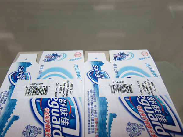 對舒膚佳包裝盒進行平面貼標的樣品圖片。