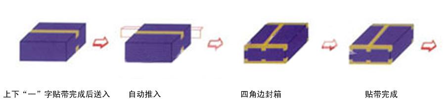◆ 操作流程:上下“一”字貼帶完成后送入—自動(dòng)推入?四角邊封箱?貼帶完成